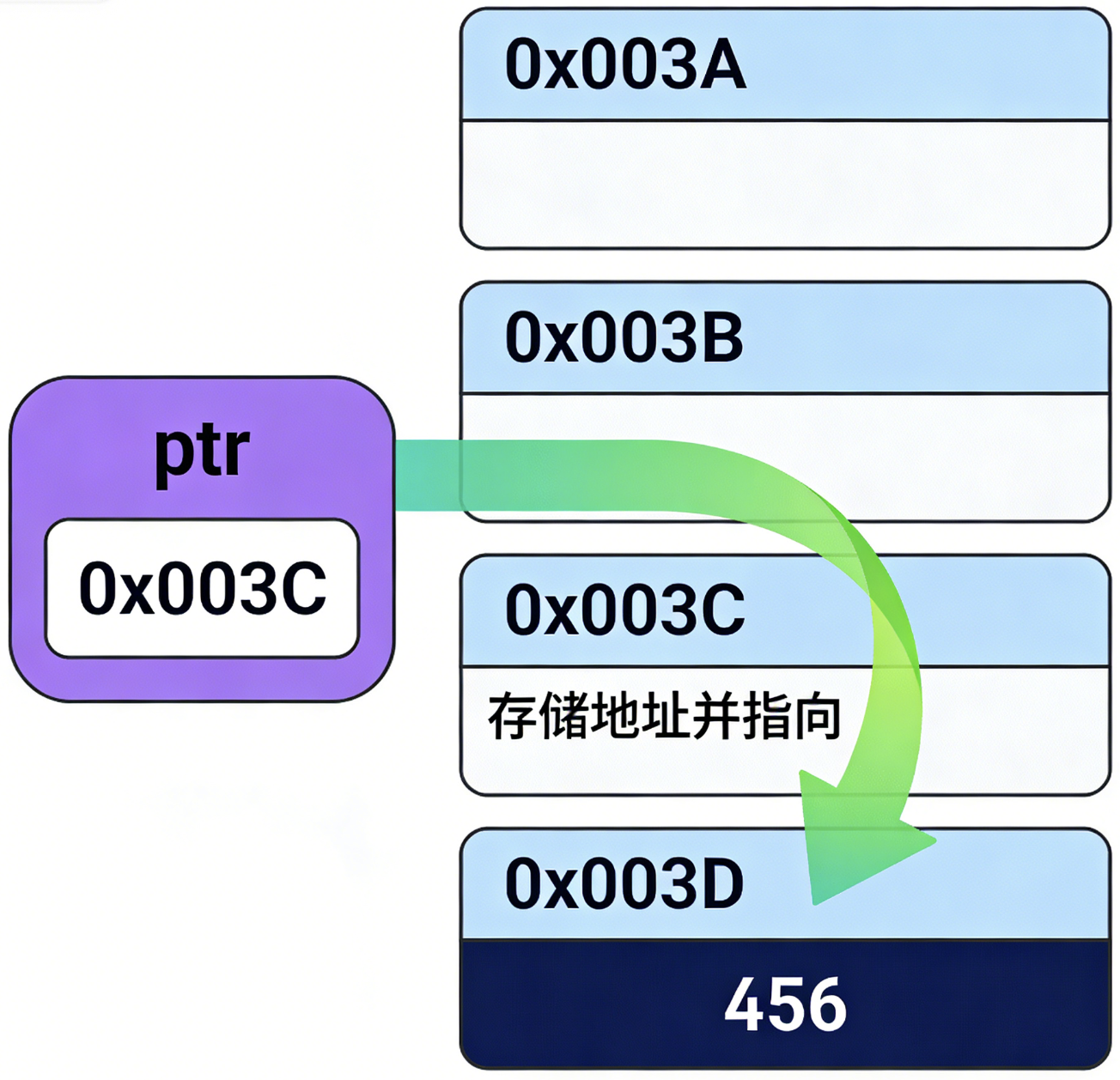 p 保存了 i 的地址,因此 p 指向 i;为什么呢?因为 p 里面是 i 的地址,通过 p 就能找到 i,所以 p 指向 i。比如我知道你的家庭地址,我就可以找到你。 -