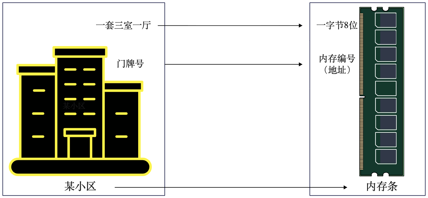 内存分为了很多单元或者很多小格子,每个格子一个编号。相当于我们的房子,一个房子一个编号,内存是一个格子一个编号,每个格子只能存放8个0或者8个1,就像每个房子有固定的房间“三室一厅”。- 内存条中分为了很多小单元。一个单元有8位,可以存放8个0或者8个1,内存单位不是