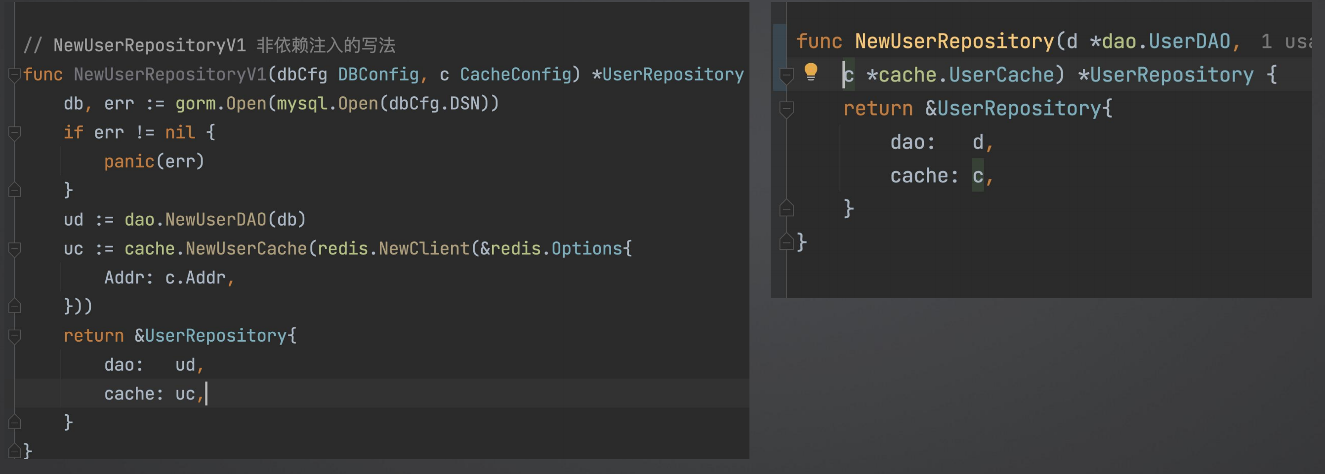 依赖注入写法:不关心依赖是如何构造的。 非依赖注入写法:必须自己初始化依赖,比如说 Repository 需要知道如何初始化 DAO 和 Cache。由此带来的缺点是: