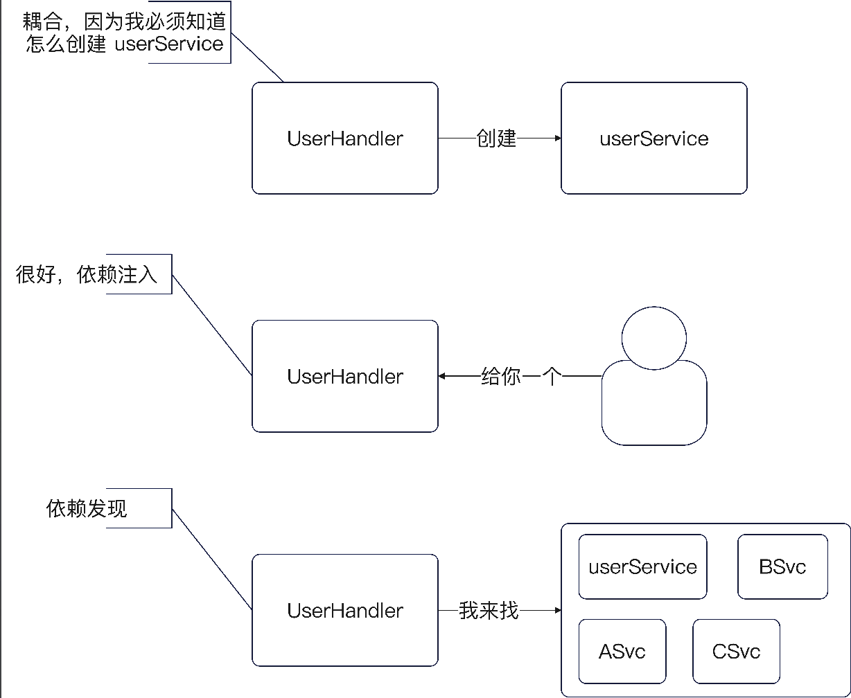 控制反转的意思就是,UserHandler 不会去初始化UserService。要么外面传入 UserService 给UserHandler,这种叫做依赖注入;要么是 UserHandler自己去找一个 UserService,这种叫做依赖查找。